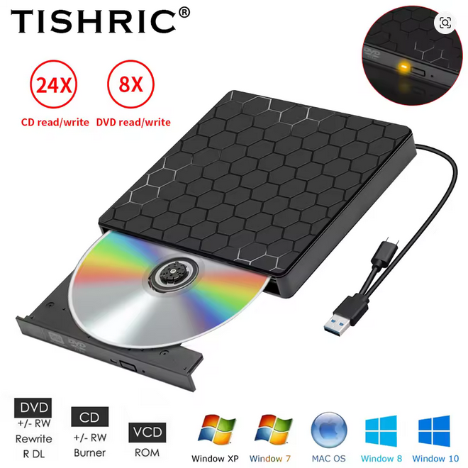 TISHRIC Type C USB 3.0 External CD Player Reader Burner External DVD Drive Writer DVD-RW CD-RW VCD ROM For PC Laptop Desktop